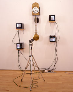 ![]() 白南准 影像吊灯 十 综合媒体 Ø 130 x 120 cm 1991 | ![]() 白南准 法式钟表电视 4组显示屏(松下)、时钟、录像机、三脚架 170 x 140 x 200 cm 1989 | ![]() 白南准 霓虹灯电视 - 一万里的爱 综合媒体 60 x 60 x 25 cm 1990 |