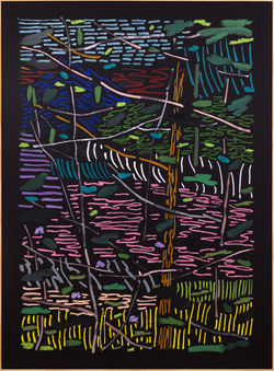 艺术家的抽象绘画探索线条与色彩之间的张力关系。这些作品背 后蕴藏着对自然结构与能量的深刻迷恋,将森林与山景提炼为大 胆的笔触与高饱和色块。其创作根植于抽象与风景绘画的双重传 统,使可辨识的自然元素(树木、灌木丛、远山)在画面中若隐 若现,而真正的"主角"实为那些充满生命力的艺术痕迹。每一道 笔触皆兼具绘画性与书写性,引领观者徜徉于色彩与线条构筑的 田野,犹如解读跃动的乐谱。